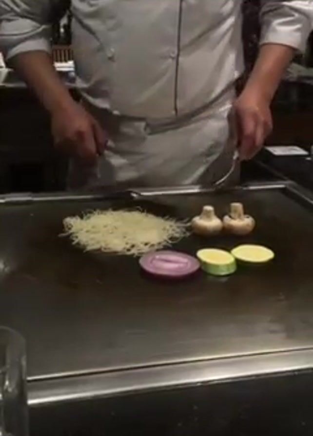 A person dressed in a chef's uniform stands in front of a flat cooktop. The cooktop contains a pile of thin noodles, a sliced red onion, two slices of zucchini, and two mushrooms. The person uses a spatula and a knife to chop the two mushrooms into smaller pieces. A clear glass sits on the counter to the left of the cooktop.