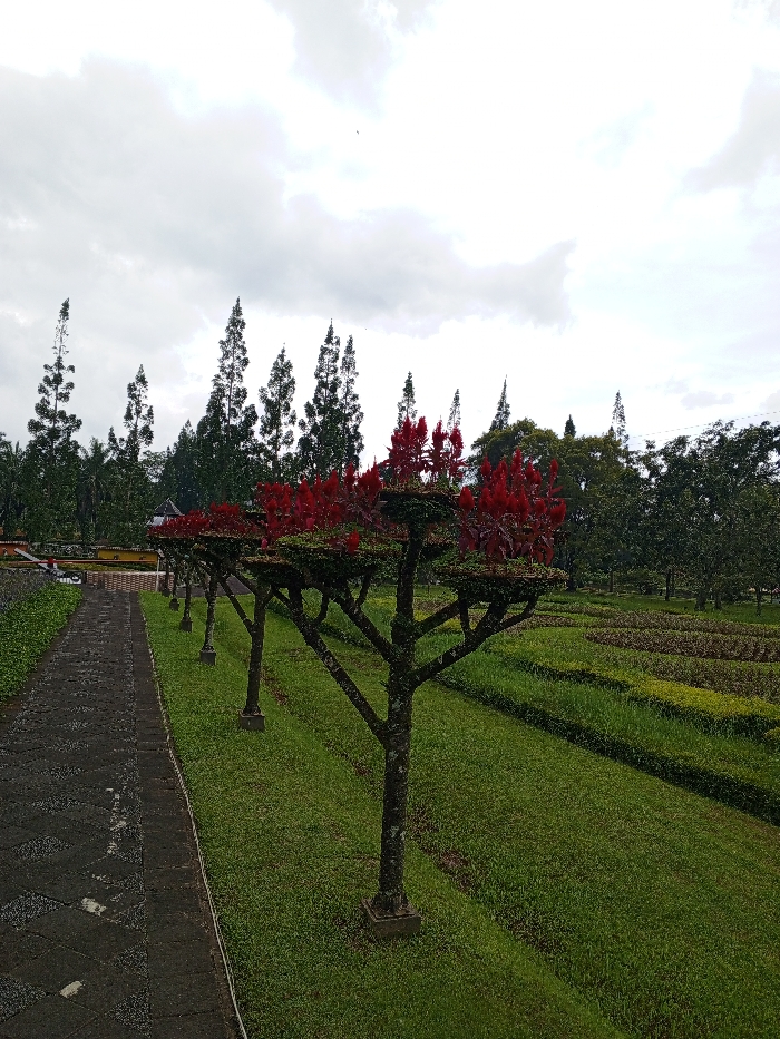 A pathway borders a manicured lawn with rows of formally pruned trees. Each tree supports a flat crown of greenery topped with vibrant red flowers. In the background, evergreen trees reach towards a cloudy sky. A neatly cultivated garden sits on the right side of the image, its rows meticulously arranged. The overall scene is peaceful and orderly, characteristic of a well-maintained landscape.