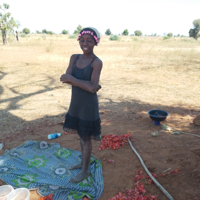 This image depicts an outdoor scene in Numan, Nigeria. A young female stands barefoot in the center-left, facing slightly right with her eyes closed or squinted and a subtle smile. She wears a dark grey sleeveless dress with ruffled trim at the hem and a light-colored headband adorned with pink spherical beads. Her arms are crossed in front of her chest. The ground consists of reddish-brown earth. Beneath the female's feet, a blue and green patterned blanket is spread. To her immediate left, partially visible, are two white plastic containers. To her right, a substantial pile of reddish-orange plant material is scattered on the ground. A long, light-colored wooden stick lies diagonally across the ground, partially over the scattered plant material. Further to the right, a black bowl rests on a blue plastic stand, containing dark, round objects and some lighter-colored plant fragments. A white plastic bottle with a blue cap is visible on the blanket near her left foot. The background consists of a dry, open field with sparse, light brown vegetation. Scattered small trees and shrubs are visible in the mid-ground and distant background under a clear, bright sky. Shadows are present on the ground.