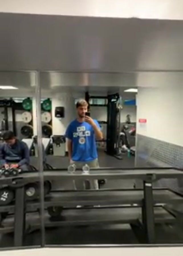 A young man with light skin and a beard is taking a selfie in a mirror in a gym. He is wearing a blue t-shirt with "Go Clips" printed on it. There are dumbbells on a rack in front of him. Other people can be seen in the background of the gym. The gym has various workout machines and equipment.