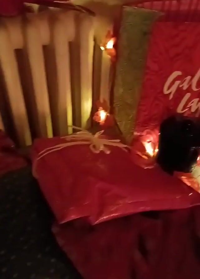 collection of gifts wrapped in red and other holiday-themed wrapping papers. A shopping bag with "Galeries Lafayette" printed on it is visible. The gifts are situated near a white radiator and a shelf, and the scene is decorated with warm-toned fairy lights in the shape of leaves, which add to a festive atmosphere. A few red poinsettia decorations are also visible, completing the holiday setting.