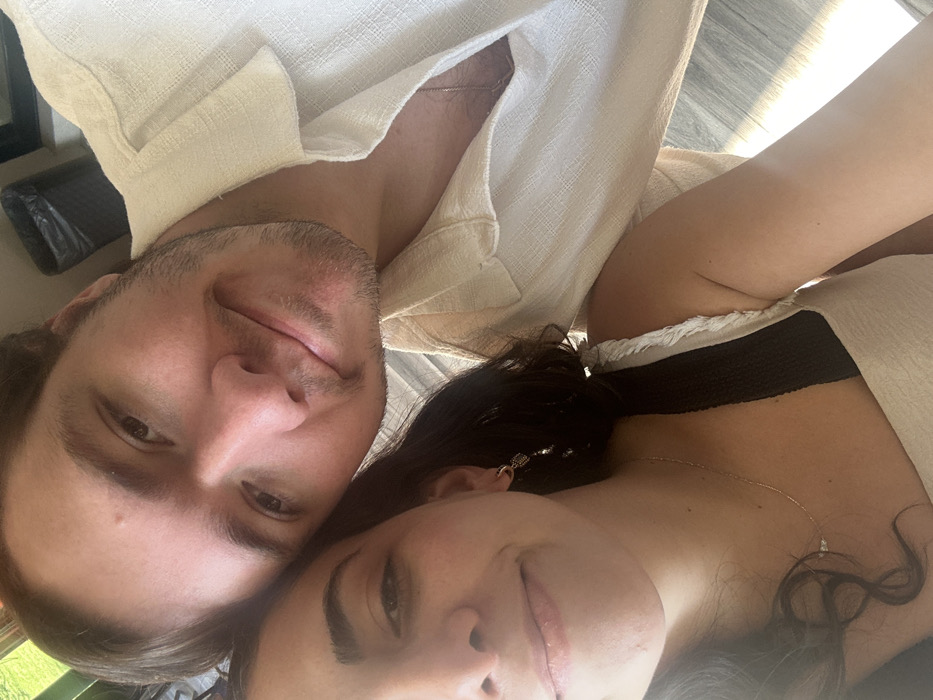 Two people, a man and a woman, pose closely together. The man has brown hair and facial hair and is wearing a light-colored, collared shirt. The woman has dark hair styled with loose curls and is wearing a black top or bra visible under a light-colored outer garment. A delicate necklace rests against her skin. The lighting is bright, and the background is indistinct. The overall impression is intimate and casual.