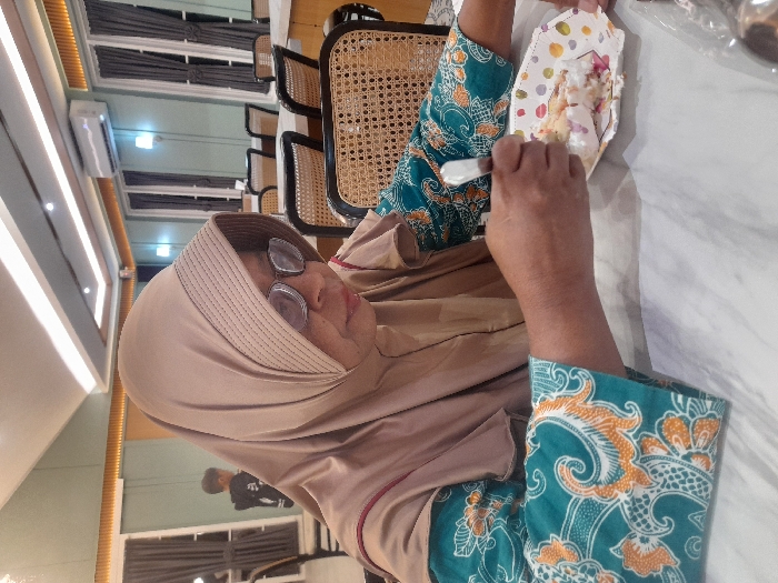 An adult female is seated at a white, marble-patterned table in an indoor dining establishment located in Kecamatan Pati, Indonesia. She wears a light brown hijab and spectacles, and a teal long-sleeved shirt with orange and white batik patterns. Her right hand holds a small utensil, likely a spoon or fork, directed towards a colorful polka-dotted paper plate containing a dessert, possibly a slice of cake or ice cream. Her head is tilted forward, and her gaze is directed at the plate. The background features light mint green walls, large windows with dark grey curtains, and multiple empty tables with chairs featuring cane-woven backs. An air conditioning unit is visible on the wall. A second individual, appearing to be a young person, is partially visible in the far left background, facing away from the camera. The environment is brightly lit by overhead artificial lighting.