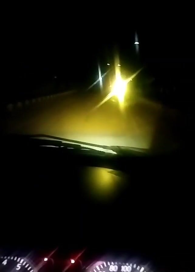 car driving at night. The headlights illuminate the road ahead, and streetlights are visible in the distance. The dashboard and speedometer are visible at the bottom of the frame. The car appears to be moving at a moderate speed.