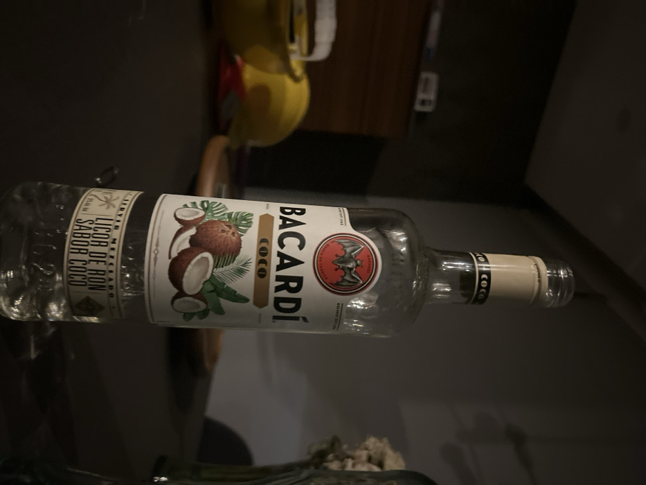 - "A clear glass bottle of Bacardí Coco coconut-flavored rum liqueur is centrally positioned and slightly tilted on a dark, flat surface within an dimly lit indoor environment in San Bernardino Tlaxcalancingo, Mexico" by FM-1wgVx1, licensed under CC BY 4.0