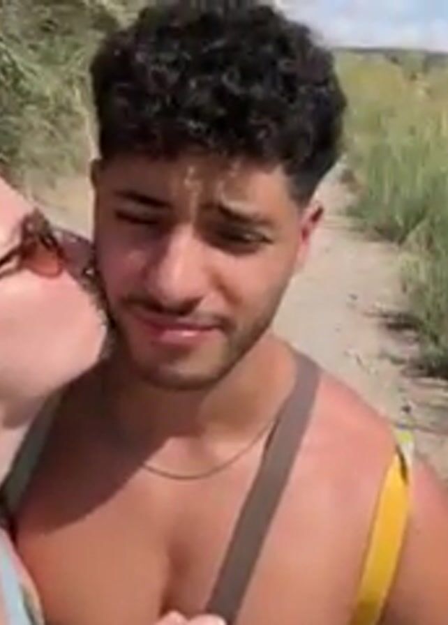A young couple is walking along a dirt path. The woman wears sunglasses and a green and blue tank top, and the man is shirtless with a yellow strap over his shoulder. They are surrounded by tall, dry grass. The man looks at the camera and smiles, then kisses the woman on the cheek. The sky is visible in the background.