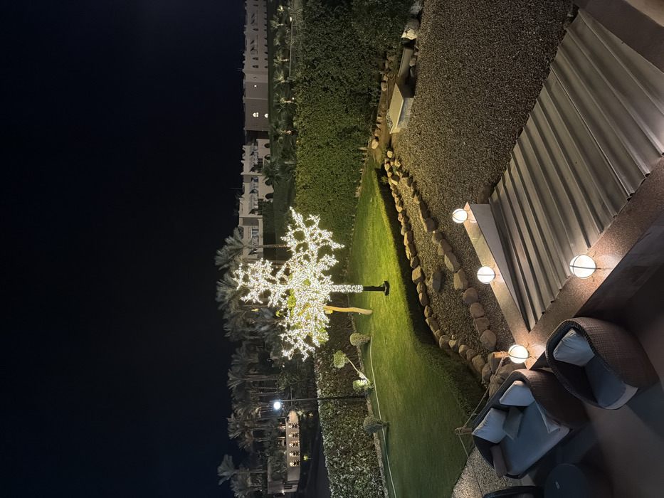The image displays an illuminated outdoor resort area at night in Sharm El Sheikh, Egypt, viewed from an elevated position. In the foreground, an outdoor seating arrangement consists of a dark brown rattan-style sofa with light cushions and a matching armchair, positioned next to a small, dark round table. A low wall, possibly a step or border, features three spherical, caged white lights. Below this wall, a corrugated metal surface, likely a set of steps or a covered area, extends downwards. The midground features a manicured green lawn, separated from the foreground by a gravel path bordered with natural stones. Dominating the lawn is a decorative tree, bare of leaves but densely covered in bright white LED lights, providing significant illumination. Two smaller, topiaried shrubs are also visible on the lawn. A tall, well-maintained green hedge forms a backdrop to the lawn area. In the background, numerous palm trees are silhouetted against the dark night sky. Beyond the trees, several multi-story buildings with light-colored facades and distinctive architectural features, including archways and balconies, are visible, consistent with resort accommodations. The entire scene is artificially lit, and no individuals are present.
