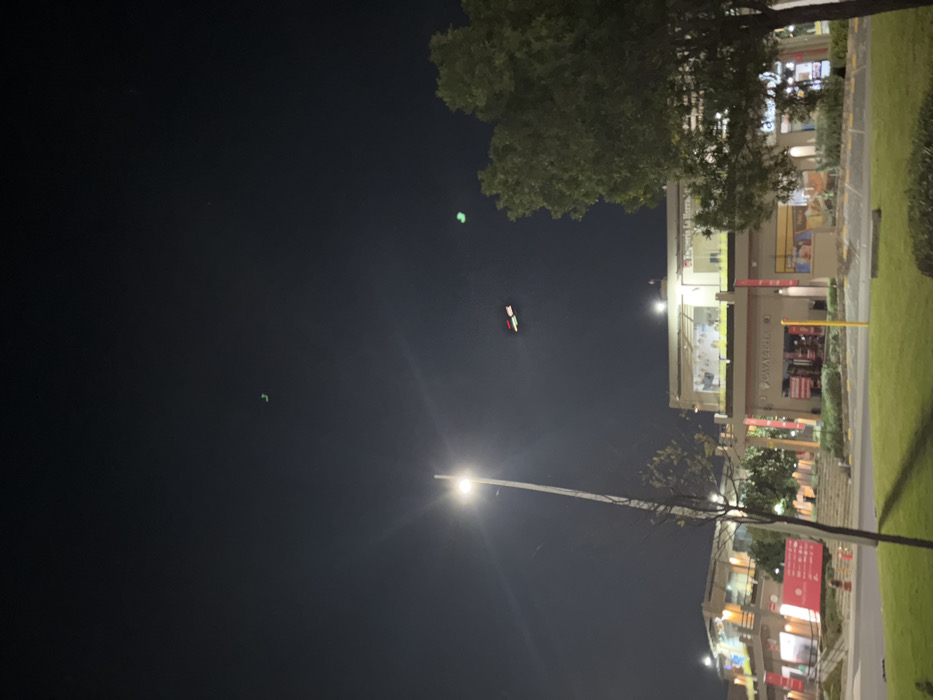 Night scene with a building to the right partially obscured by trees. A streetlight illuminates the lower portion of the frame. Two small green lights are visible in the dark sky, along with a red and white object appearing to float. The building is multi-storied with lights visible inside. There is grass and a sidewalk adjacent to the building. A pole runs diagonally from the bottom center towards the building.
