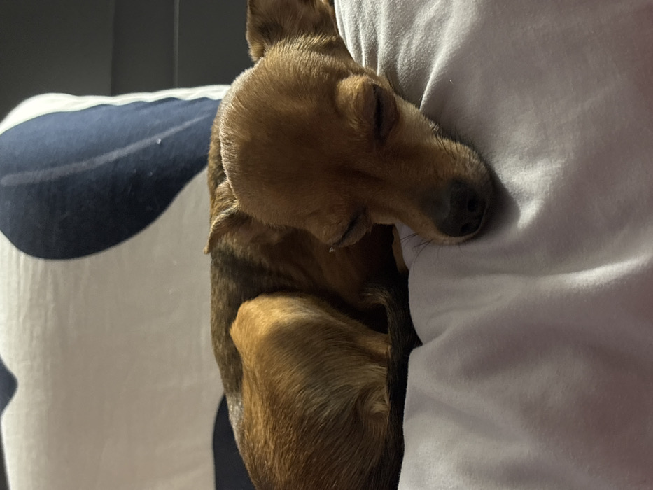 The image depicts an indoor scene in the city of Unknown, Unknown. A small, short-haired dog, displaying reddish-brown fur with darker brown areas on its back and a dark tail, is observed in a sleeping state. Its eyes are closed, and its head rests on a light grey or white fabric surface, consistent with bedding or clothing. A blurred background element features sections of white and dark blue material.