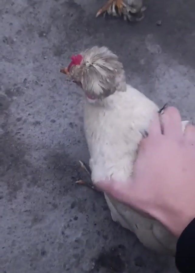 A hand strokes the back of a crouching chicken with grey and white feathers, a red comb, and feathered feet. Another white chicken with a red comb stands behind it, also with feathered feet. The chickens are on a grey concrete surface that appears damp. Some weeds are visible in the background.
