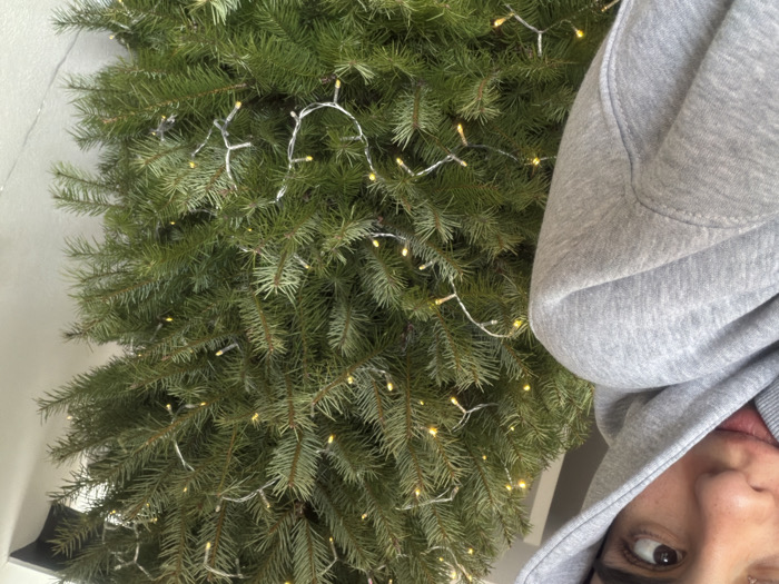 An individual is partially visible, wearing a gray hooded sweatshirt. To the left, there is a lush green fir tree adorned with small, warm white lights. The background is a light gray wall. The overall image composition is slightly tilted.