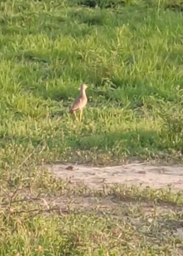 bird standing in a grassy field. It has a light brown head and neck, a darker back, and yellow legs. The grass is green and there is a dirt patch in the foreground.