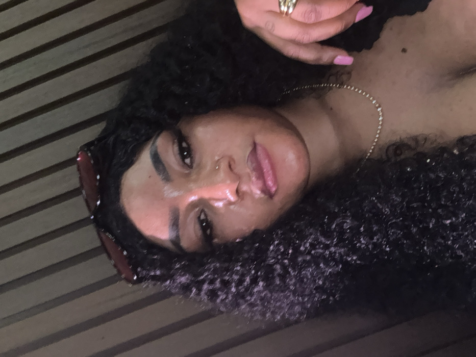 A close-up image depicts a single individual, appearing to be an adult female with dark skin, directly facing the camera
