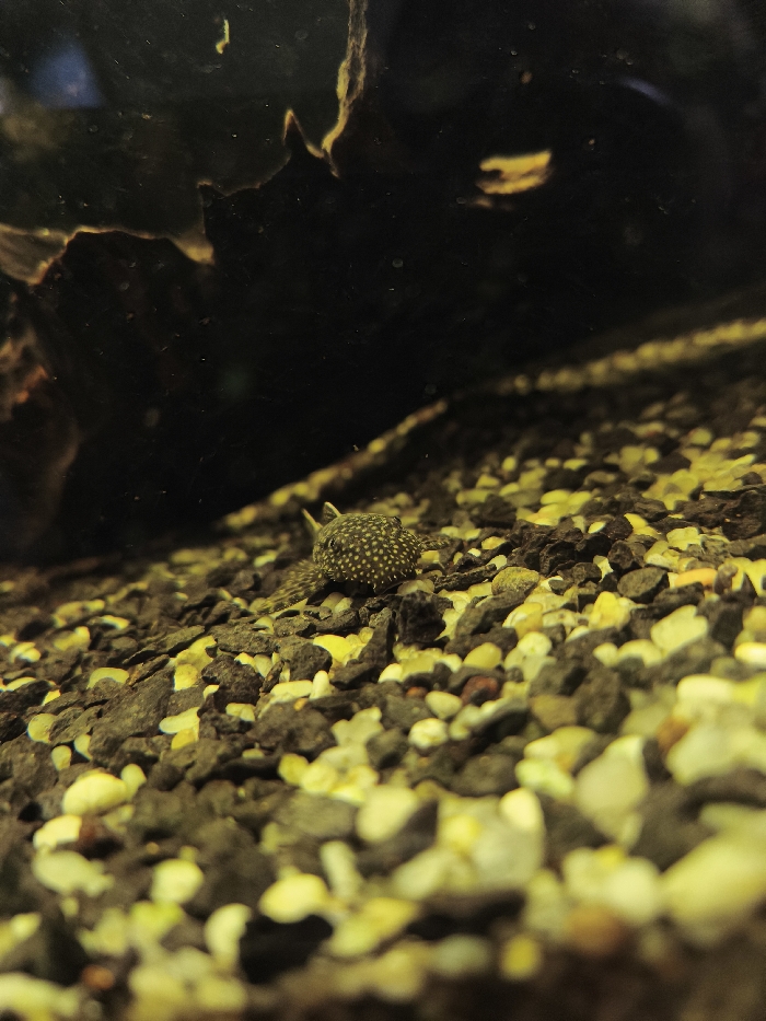 The image displays an aquatic environment, specifically an aquarium, located in Dimitrovgrad, Bulgaria. The central subject is a small, flattened fish, likely a plecostomus or similar species, exhibiting a dark coloration adorned with numerous small, light-colored spots. The fish is positioned on a substrate composed of irregularly shaped gravel, approximately 5-10mm in diameter, consisting of a mixture of dark grey/brown and light yellow/beige pebbles. The fish is oriented with its head facing towards the right side of the frame. In the upper-left background, a large, dark, indistinct object, possibly a piece of driftwood or rock, is present, displaying some subtle yellowish-brown edges. The lighting is subdued, and no human subjects or apparent interactions are depicted within the scene.