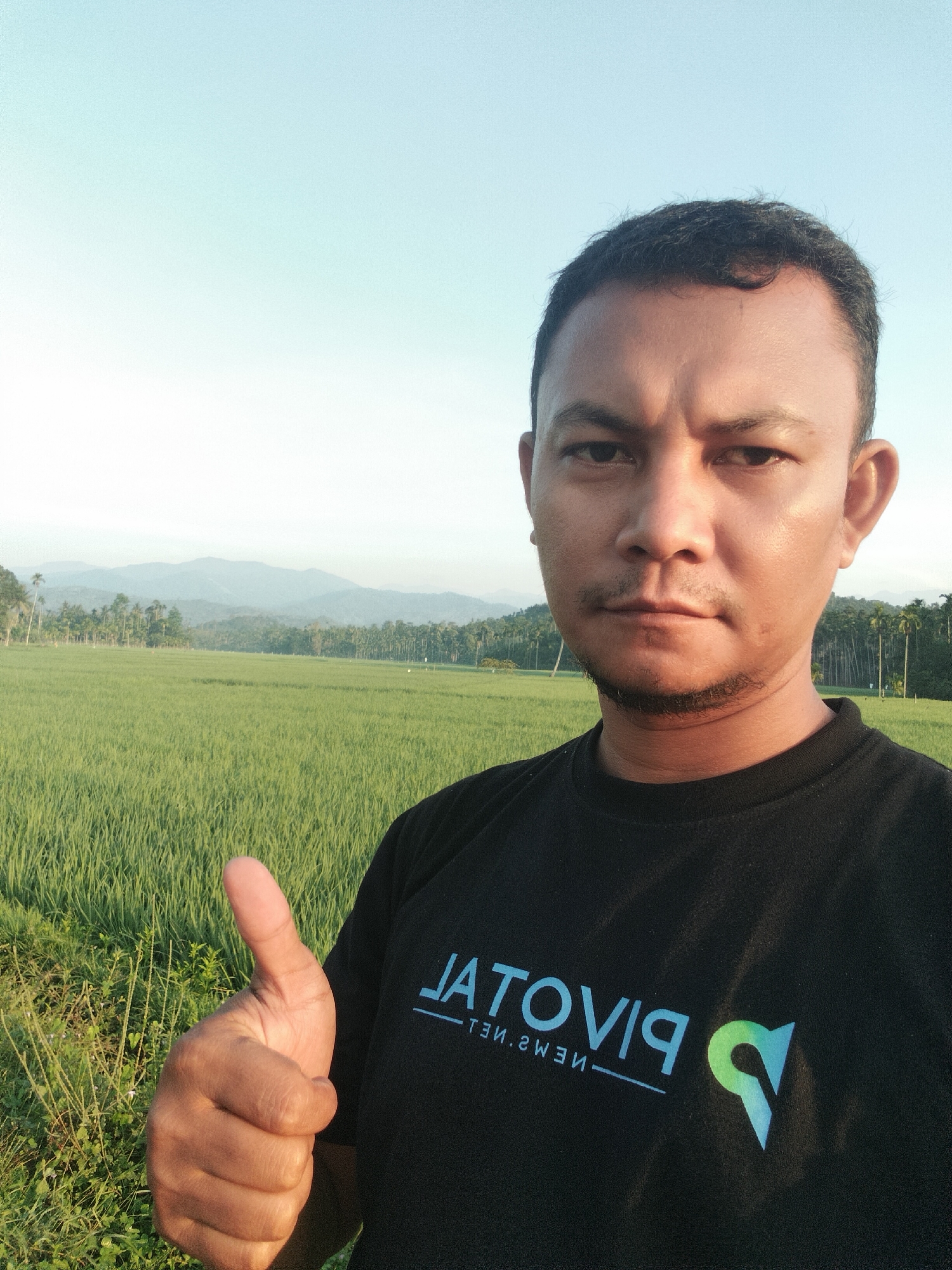 A male individual, presumed to be of Southeast Asian descent, is depicted in a close-up, chest-up shot, facing the camera with a neutral expression. He has short, dark hair, a light mustache, and a short beard. He wears a black crew-neck t-shirt with the text "PIVOTAL NEWS.NET" and a stylized "P" logo visible in reverse on his chest, indicating a selfie perspective. His left hand is extended into the lower left of the frame, forming a "thumbs-up" gesture. The background reveals a vast, verdant rice paddy field in Meunasahalue, Indonesia, under a clear, pale blue sky. Beyond the field, numerous tall palm trees are visible, with a hazy mountain range in the far distance. The scene is illuminated by natural daylight.