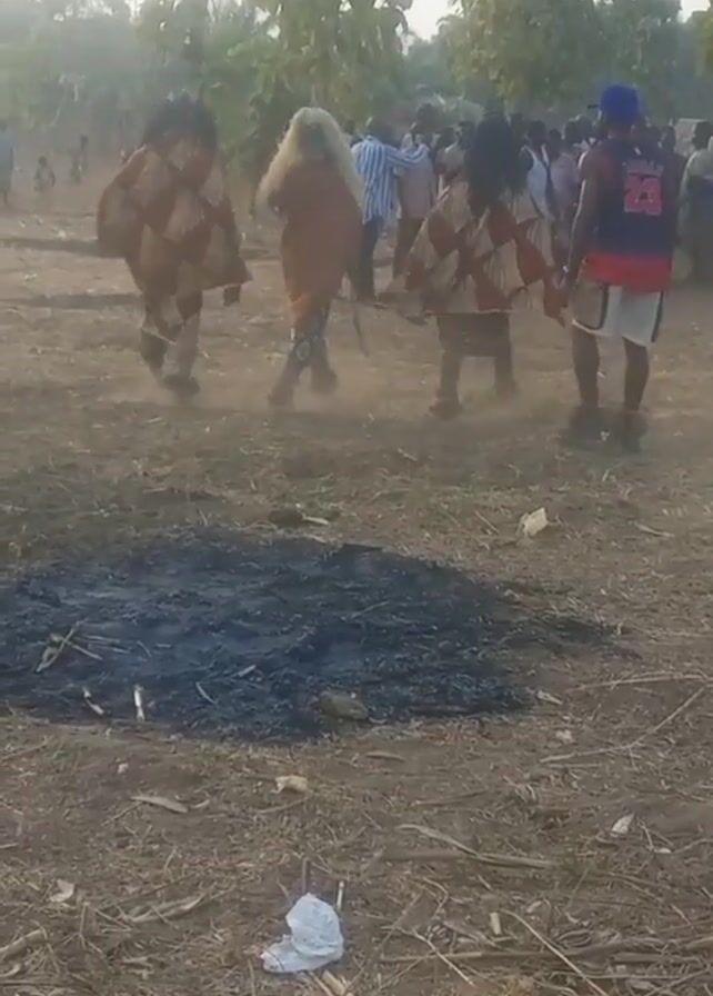 In a dry, dusty field, several people, some wearing masks and distinctive costumes, participate in what appears to be a traditional dance or ceremony. The participants in costume move around, kicking up dust as they dance, while onlookers watch in the background. A dark, burnt patch of ground is visible in the foreground, with scattered debris. A man in a basketball jersey and ankle weights stands near the dancers, possibly observing or participating. The environment includes scattered trees and a general sense of a rural or village setting.