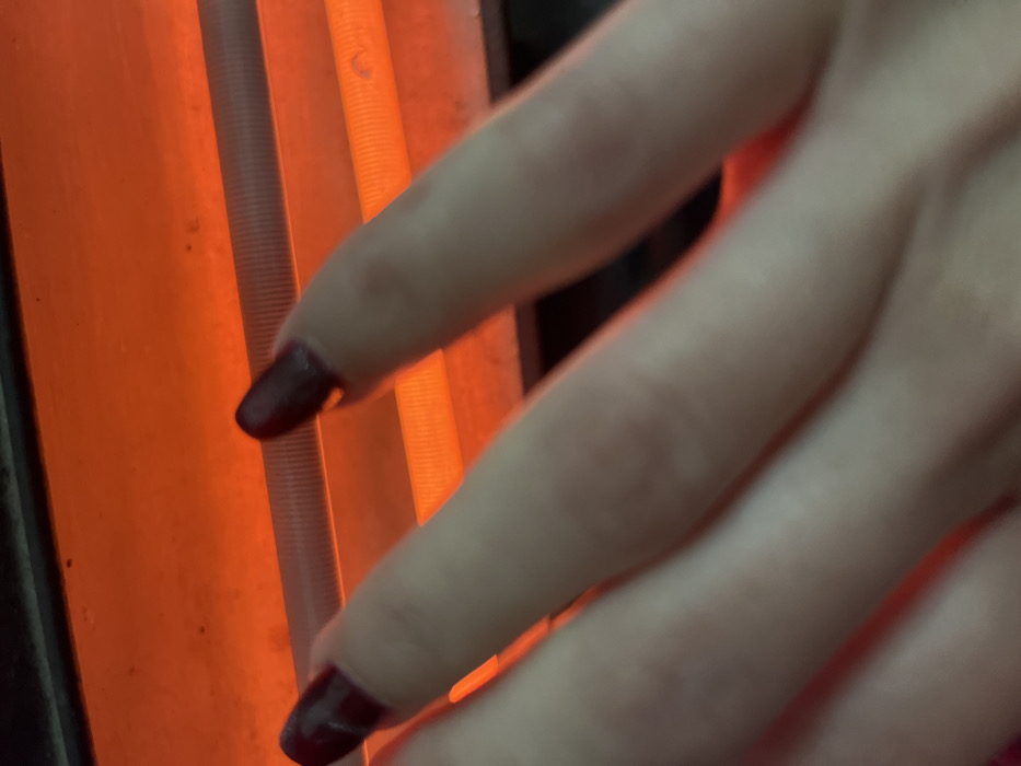 An extreme close-up shows a hand with two fingers prominent, adorned with dark red nail polish. The fingers are positioned in front of an orange, possibly heated, surface with vertical lines. The skin tone of the hand is fair. The image is slightly out of focus, emphasizing the hand's texture and the intense orange glow of the background.