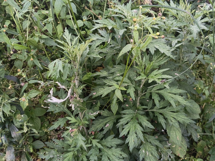 The image presents a dense, overgrown patch of vegetation in Ho Chi Minh City, Vietnam. The scene is dominated by several leafy green plants with deeply lobed, serrated leaves, consistent with a species such as mugwort (Artemisia vulgaris). These plants exhibit various shades of green, with some lighter green new growth at the top and darker, mature leaves below. Towards the lower left, several leaves appear damaged, desiccated, and light grey or white in color. Interspersed throughout the dense foliage are other plant species, including those with smaller, rounder leaves and some bearing small, light yellow or pale brown clustered flowers and slender green seed pods, particularly visible in the upper-central area. A small, dark-bodied insect, possibly a fly, is visible resting on a large leaf in the lower right quadrant of the image. Fine, translucent white strands, consistent with spider silk or a spider web, are present across multiple stems and leaves, notably on the right side of the frame. The environment is an uncultivated, wild patch of ground under natural light conditions, with no specific human objects or structures visible. No individuals are present.