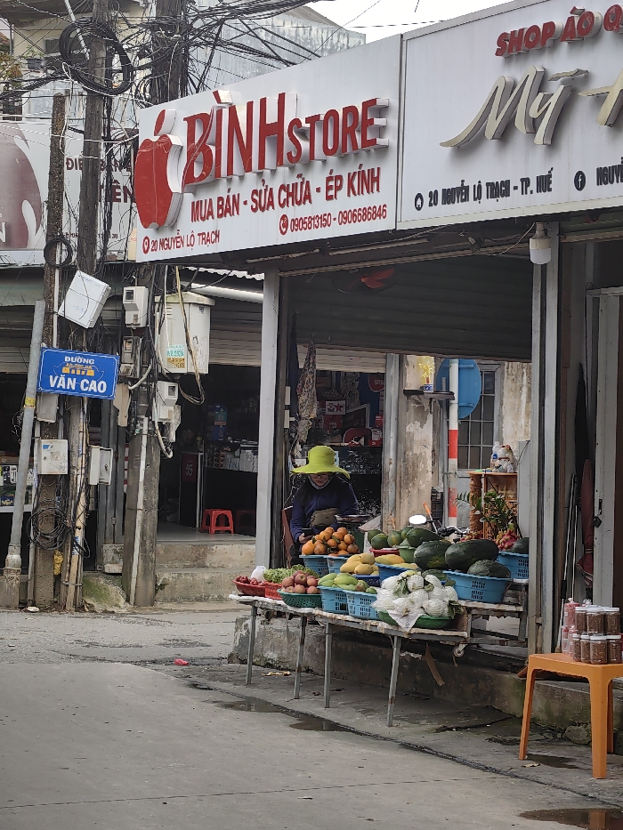 This image depicts a bustling street scene in Vỹ Dạ Ward, Huế City, Vietnam, specifically at 20 Nguyễn Lộ Trạch street, near the intersection with Đường Vân Cao. The foreground features a makeshift fruit stall consisting of two metal-legged tables covered with a light-colored material, positioned on a concrete sidewalk. The tables are laden with fresh produce displayed in multiple blue plastic baskets. Visible items include piles of oranges/tangerines, various mangoes, large green gourds or watermelons, light-green pomelos (some individually wrapped in plastic), red apples or plums, rambutan, and some leafy green vegetables. To the far right of the stall, a small orange plastic stool holds several clear plastic jars containing what appears to be dried food or spices. Behind the fruit stall, one individual is present, wearing a wide-brimmed, bright lime green hat, a dark long-sleeved shirt, and a face covering. This person is positioned facing downwards, seemingly attending to items on the stall or using a mobile device. A small scooter or motorbike is partially visible parked behind the stall, and a small shrine with offerings is visible within the adjacent storefront on the right. The background shows commercial buildings. On the right, a white storefront sign reads "BÌNH STORE" with a prominent red Apple logo. Below it, text states "MUA BÁN - SỬA CHỮA - ÉP KÍNH" (Buy - Sell - Repair - Glass Press) and lists phone numbers and the address "20 NGUYỄN LỘ TRẠCH - TP. HUẾ". Adjacent to "BÌNH STORE" is another sign, partially visible, reading "SHOP ÁO QUẦN Mỹ H...". Further back within the "BÌNH STORE" entrance, a red plastic stool is visible. To the left, a wooden utility pole dominates the mid-ground, heavily strung with a dense network of black electrical wires and several white utility boxes. A blue street sign affixed to this pole clearly indicates "ĐƯỜNG VÂN CAO" (Vân Cao Street). The street itself is concrete, appearing wet in places, and leads towards other buildings partially obscured by the utility pole. The overall environment is urban, indicating active commerce.