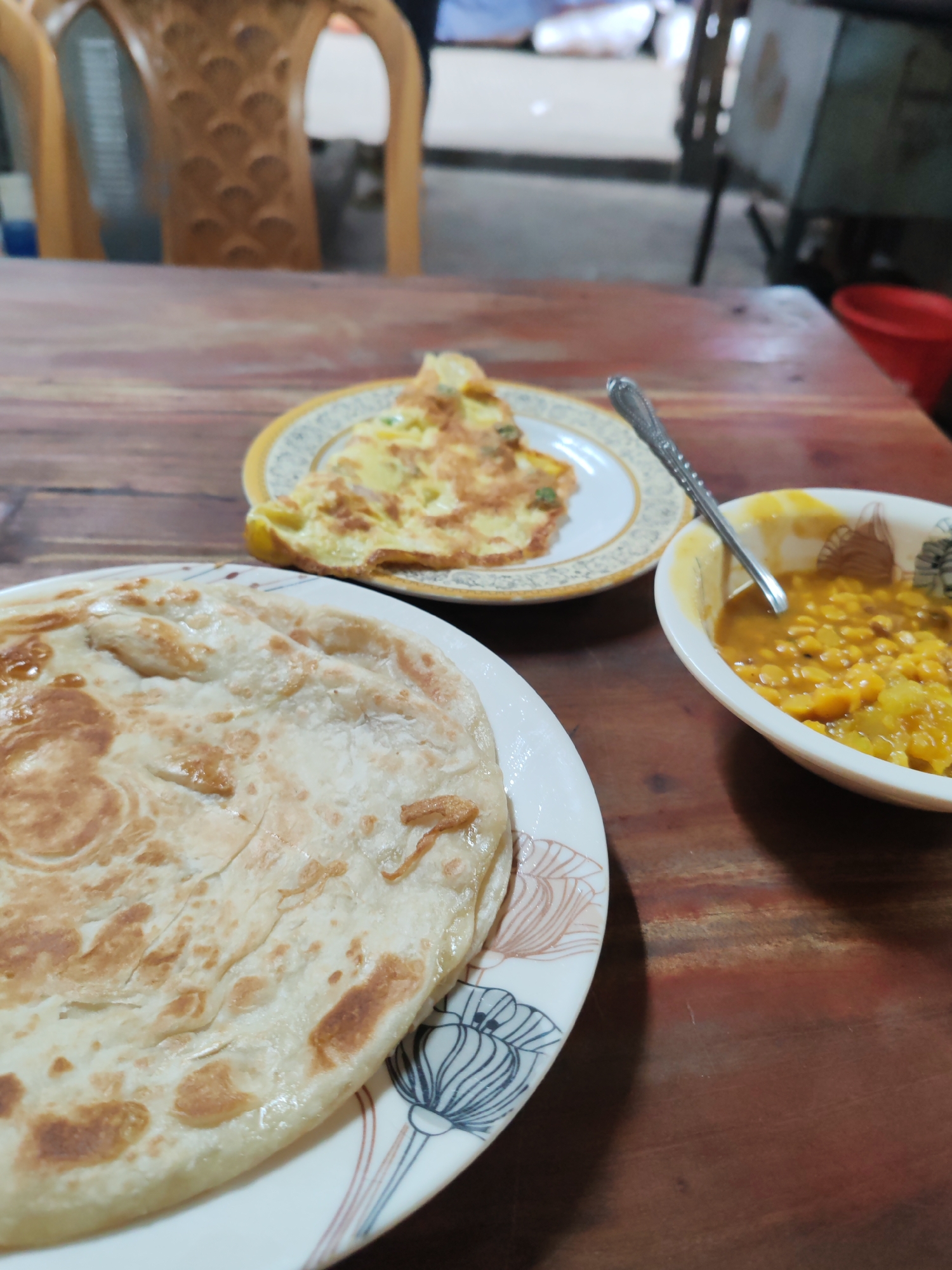 A street food scene in Dhaka, Bangladesh: A wooden table is set with a plate of paratha, an omelet, and a bowl of dal, likely chana dal