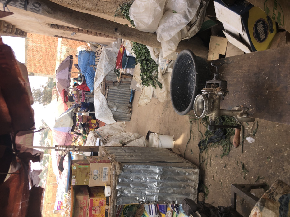 This image depicts a bustling outdoor market scene in Bukuru, Nigeria, characterized by a narrow, unpaved pathway flanked by various vendor stalls. In the immediate foreground, a weathered hand-crank grinder with a wooden handle is mounted on a rough wooden surface, positioned next to a black plastic basin containing liquid. To the left, a corrugated metal structure serves as a stall base, topped with multiple cardboard boxes, a plastic tray, and a small white cup. The ground is dirt, strewn with green plant material, possibly discarded produce, and other debris. A white plastic bucket stands against the corrugated metal stall. Further into the midground, the pathway extends between more market stalls. On the left, another vendor stall with a partial view shows items stacked under a covering. On the right, a mud-brick wall runs parallel to the path, with a wooden post leaning against it. Piles of white sacks and loose green leaves are visible near the wall and along the path. Several individuals are present deeper within the market. One person wearing a yellow top is visible seated at a stall on the left, partially obscured by an umbrella. Further back, multiple individuals, including one in red attire, are seen near stalls covered by colorful umbrellas and blue tarpaulins, suggesting active commerce. Small, roughly constructed shelters made of corrugated metal and tarpaulin are also present. The background reveals additional brick buildings and a tree-lined horizon under a bright sky. The overall scene suggests a busy, open-air marketplace with diverse goods and rudimentary infrastructure.
