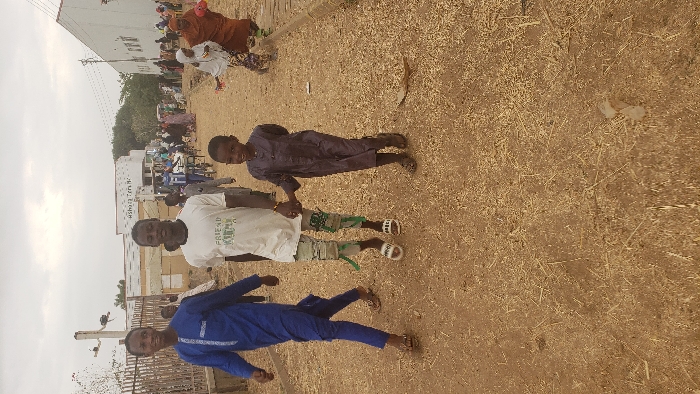 Three young boys stand on a dirt ground near a building, possibly a school. The boy in front wears a blue robe, the middle boy a white t-shirt and patterned shorts, and the back boy a dark robe. Other people and buildings can be seen in the background. The area appears to be dusty. The photo is rotated, making the subjects appear sideways.