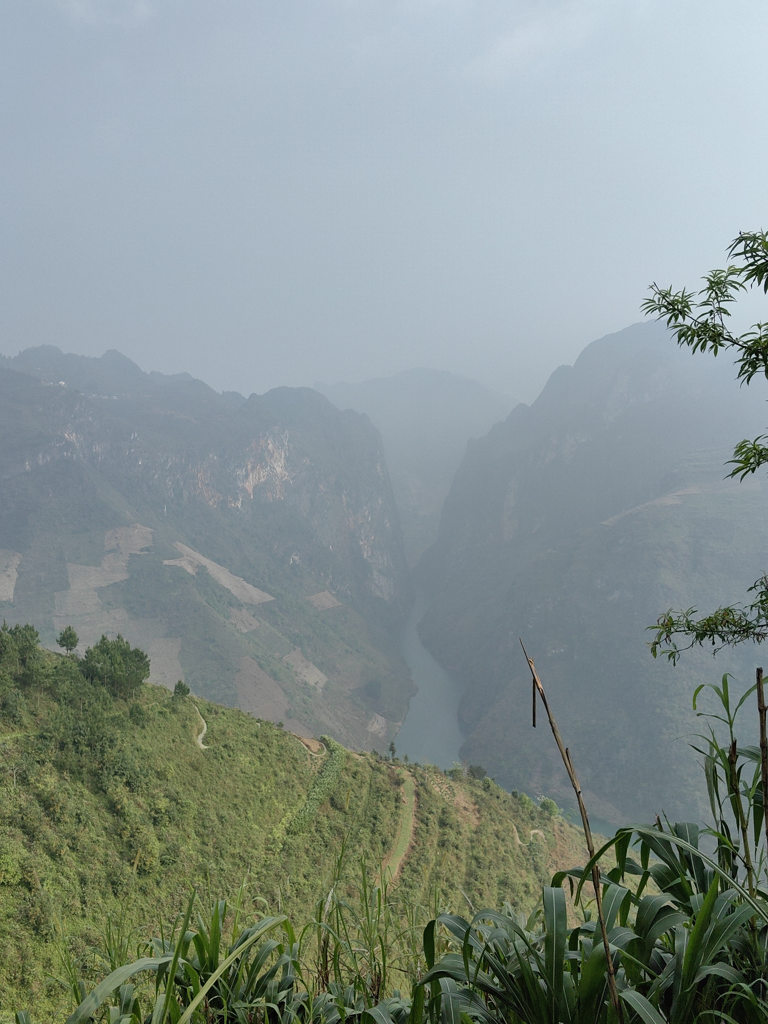 mountain landscape in Mèo Vạc Commune, Vietnam, viewed from an elevated position. A river flows through a deep valley carved between the mountains. Terraced farming is visible on the mountainsides. Vegetation, including trees and tall grasses, is in the foreground. The sky is overcast, and haze obscures the distant mountain ranges.