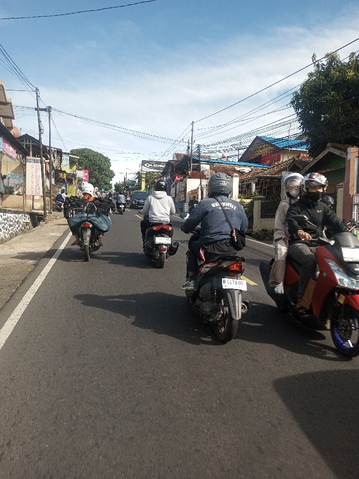 This image depicts a busy street scene in the city of Phonengam, Laos, under a clear blue sky. Multiple motorcycles are observed traveling in the same direction on an asphalt road that appears to have at least two lanes and is marked with a solid white line on its left edge. In the immediate foreground on the right, a red scooter carries two individuals. The driver wears a dark long-sleeved shirt, dark pants, black gloves, a dark helmet with a clear visor, and a white face mask. The passenger, seated behind, wears a light-colored long-sleeved top, light pants, a white helmet, and a light-colored face mask. To the left of the red scooter, a male rider operates a dark scooter. He wears a dark blue long-sleeved top with partial white lettering, dark pants, and a dark helmet. The scooter's license plate is visible, displaying "B 4470 BO". Further to the left, another male rider on a dark scooter is seen wearing a light grey hooded sweatshirt and a dark helmet. On the far left side of the road, a scooter with a rider in a white helmet transports a large, dark-colored bundle, possibly containing clothing such as blue jeans, secured to its rear. Several other motorcycles and a light-colored car are visible further down the road in the background. Distinct shadows of the motorcycles and riders are cast onto the road surface, indicating a low sun angle, consistent with morning or late afternoon. Both sides of the road are lined with various commercial and residential buildings, some featuring blue corrugated metal roofs. Visible signage includes "DISTRIBUTOR PVC" on the left and "PLATINUM" further down the street. Numerous overhead utility lines are strung across the frame, supported by utility poles.