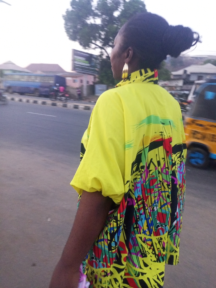 A person is seen from the side, on a street. They have their hair in a bun. The individual is wearing a bright yellow shirt or dress with colorful abstract designs. They are also wearing large hoop earrings. In the background, there are buildings, a road, and vehicles, including a blue bus and a yellow auto rickshaw. The scene is captured during daylight.
