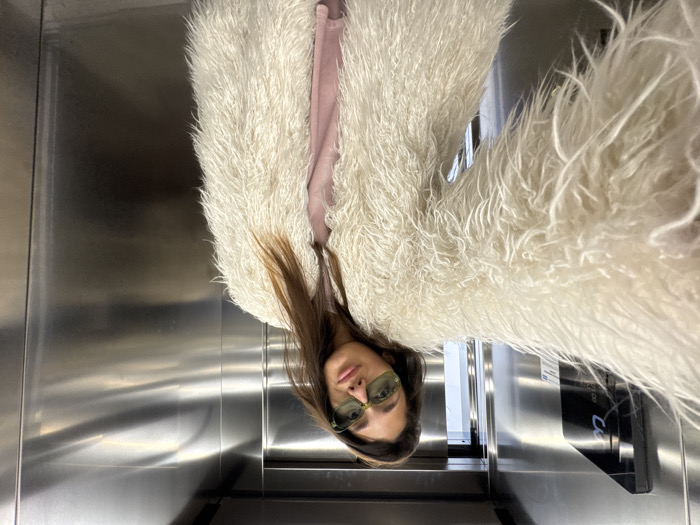 The image depicts a female individual taking a selfie inside an elevator in Budva, Montenegro. The subject has long, dark brown hair and is wearing green-tinted sunglasses. She is dressed in a voluminous, white, shaggy-textured coat over a light pink or mauve top. Her right arm is extended, holding the camera. The woman is looking directly at the camera with a slight smile and her head tilted minimally. The elevator interior features brushed metallic walls and a black control panel with white text and symbols partially visible on the left side.