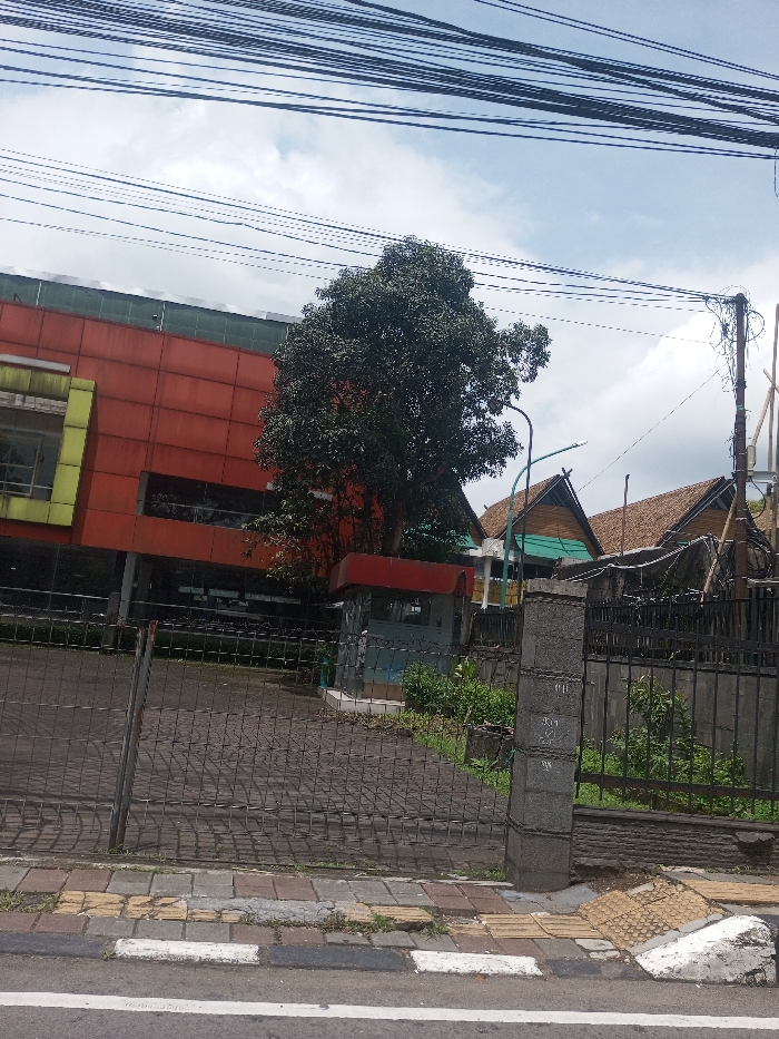 This image presents an exterior view in Chori, Nigeria, under an overcast sky. In the foreground, a paved road with a white edge line gives way to a sidewalk featuring gray, white, and yellow tactile paving. A black chain-link fence, supported by a gray concrete pillar on the right, delineates the street from an adjacent property. Behind the fence, a large building with an orange facade and yellow architectural elements is visible on the left. A small, light blue structure with a red roof, possibly a kiosk or guard post, stands in front of this building. A large, dark green tree occupies the central midground, partially obscuring the orange building. To the right of the tree, several single-story structures with brown roofs and some green-painted walls are discernible. A street light pole stands near the tree, and a utility pole densely wrapped with numerous black electrical wires is present on the far right. Numerous black overhead electrical wires crisscross the sky. No human subjects are present in the frame.