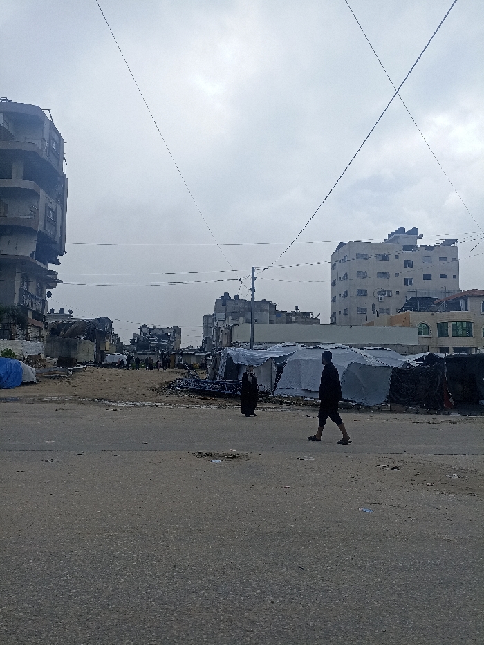 The image depicts a street scene in the city of Gaza, Palestinian Territory, characterized by significant urban damage under an overcast sky. In the foreground, an asphalt road shows scattered debris. In the midground, two individuals are present: an adult male in dark clothing and sandals walks right to left, and an adult female in dark, loose clothing with a head covering stands stationary. To the right of the road, a series of temporary shelters constructed from light-colored tarpaulins are erected. Behind these shelters and further into the background, numerous multi-story buildings exhibit extensive structural damage, including exposed rebar and collapsed sections. A blue tarpaulin is visible among rubble on the left. Overhead, multiple utility wires crisscross the frame, connected to visible poles. A fallen metal structure lies on the ground near the temporary shelters.