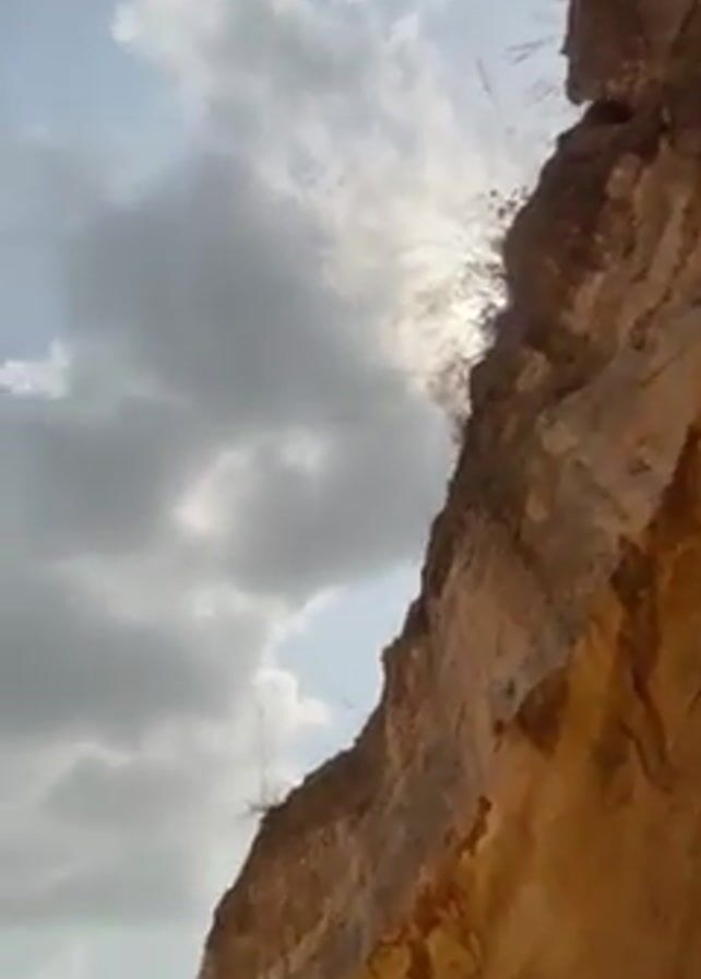 The video presents a low-angle view of a cliff formation against a cloudy sky