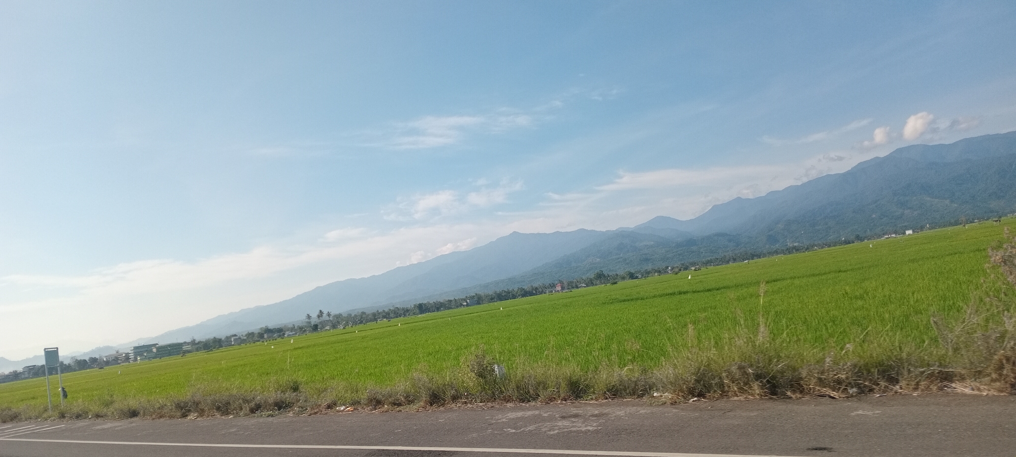 rural landscape in Uleeue, Indonesia, on a clear day with a blue sky. A vast, bright green rice field stretches across the middle ground, ascending diagonally from left to right. In the background, a mountain range is visible, its peaks covered with varying degrees of forestation. Some buildings are visible on the field on the edge between the fields and the mountain background. In the foreground, there's an asphalt road with a shoulder covered in grass and weeds. The photograph appears to have been taken from a moving vehicle.