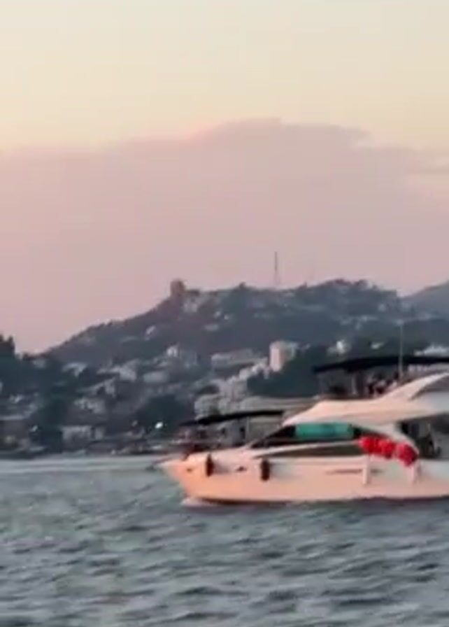 white yacht moving on the water. In the background, there is a hillside covered in buildings and trees under a pastel-colored sky with pink and white hues, possibly at sunset. The yacht has several people on board. The water is choppy and dark.