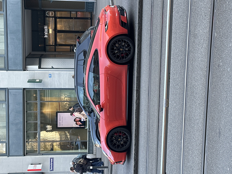 The image depicts a street scene on Bahnhofstrasse in Zurich, Switzerland, identifiable by the visible street sign and the prominent UBS bank branch on the left. A red Porsche 911 sports car, featuring black multi-spoke wheels and red brake calipers, is positioned on the right side of the road, facing left. A dark-colored SUV is partially visible behind the Porsche. In the immediate foreground, multiple tram tracks are embedded in the asphalt street, partially obscured by a horizontal metal bar. On the sidewalk in front of the UBS building, several pedestrians are present. Through the large window of the UBS branch, a digital display shows "CHF 509027 an Spenden," and two individuals are observed looking towards it. To the right of the UBS, building number 72 is visible, followed by an entrance marked "bratschi" on an adjacent building. The scene is illuminated by daylight.