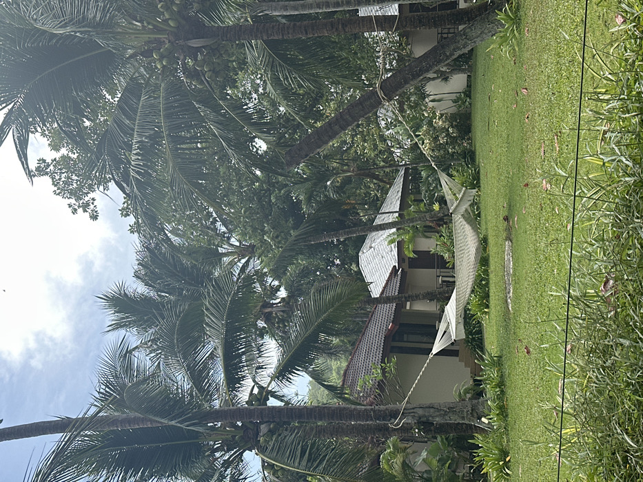 A picturesque scene shows palm trees towering over a building with a gray tile roof. A white hammock is strung between two of the palm trees, hanging gracefully over a lush green lawn. The sky is visible through the palm fronds, hinting at a sunny day. The image captures a tranquil and tropical atmosphere.