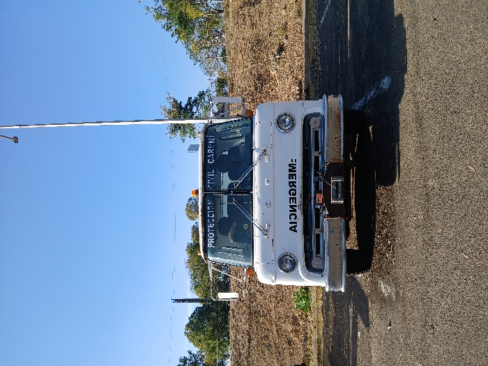 A white truck with "EMERGENCIA" (emergency) vertically printed on the front is parked on an asphalt surface