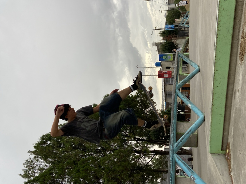 A skateboarder falls in mid-air, his body nearly parallel to the ground. He wears a gray t-shirt, denim shorts, and a maroon hat. He's next to a blue metal rail at a skatepark. Behind him is a tree and a cloudy sky. In the background, there are buildings and streetlights.