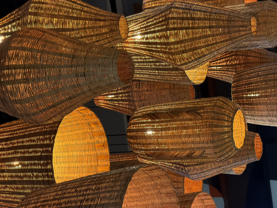 - "A cluster of multiple illuminated, woven wicker or rattan lampshades hangs from a dark ceiling, filling the frame" by FM-iZ0253, licensed under CC BY 4.0