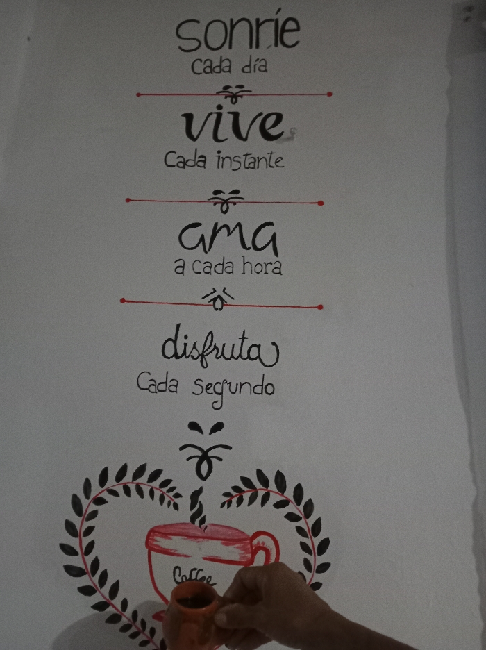 The image displays an indoor scene, specifically a white wall, within a building located in Altagracia, Venezuela. The wall is adorned with vertically arranged hand-painted text and illustrations. From top to bottom, the wall features the following black cursive Spanish phrases: 1. "sonríe" (smile), followed by "cada día" (every day). 2. A red horizontal line with black symmetrical decorative motifs on either side. 3. "vive" (live), followed by "Cada instante" (Every moment). 4. A red horizontal line with black symmetrical decorative motifs on either side. 5. "ama" (love), followed by "a cada hora" (every hour). 6. A red horizontal line with black symmetrical decorative motifs on either side. 7. "disfruta" (enjoy), followed by "Cada segundo" (Every second). 8. A single black decorative motif. Below this text, a larger illustration occupies the lower portion of the wall. It consists of a heart-shaped wreath formed by dark, leafy branches with red details. Inside this wreath, a red-rimmed coffee cup with "Coffee" written on its side is depicted, with black wavy lines above it symbolizing steam. In the lower right quadrant of the image, a human hand, exhibiting a medium skin tone, is visible. The hand is holding a small, unglazed, orange ceramic cup, or "pocillo," which contains a dark brown liquid, consistent with coffee. The cup held by the hand is positioned directly below the painted coffee cup and partially overlaps the bottom-right section of the heart-shaped wreath.