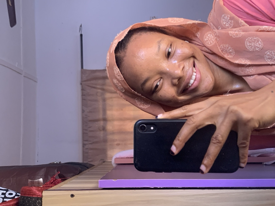A female individual with a dark skin tone is depicted indoors, positioned to take a selfie. She wears a light reddish-brown patterned headscarf and a top of a similar color, smiling broadly with her head tilted slightly. Her left hand, with darkly polished fingernails, holds a black smartphone vertically, partially obscuring the lower left portion of her face. The background on the left features a vertical light wooden panel and an adjacent purple panel, with a dark object partially visible on a higher surface, accented by red fabric elements. To the right, a light-colored wall is present, behind which hangs a light brown curtain on a dark rod. The ceiling is white with visible panel seams. Natural light illuminates the scene, creating highlights on the subject's face. The specific location within Ilorin, Nigeria, cannot be determined from the visual information provided.