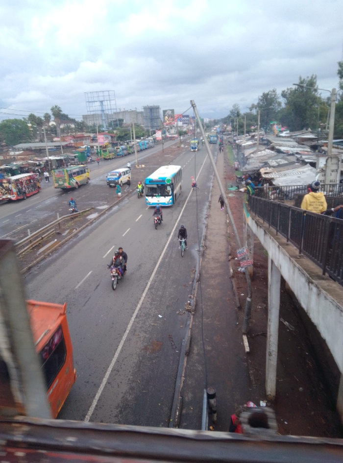 An elevated view captures a bustling urban scene. A multi-lane road is filled with vehicles: buses, minibuses, motorcycles, and a cyclist. Makeshift structures line one side of the road, while a row of colorful buses occupies the other. Pedestrians are visible alongside the road and on a pedestrian bridge. A large billboard looms in the distance under a cloudy sky. The foreground shows a section of the elevated structure from which the photo is taken.