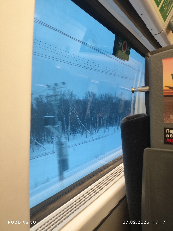 The image depicts a winter landscape observed from the interior of a train car. The location is an unknown suburban or rural area, characterized by snow cover. The scene is viewed through a large, rectangular window, tinted blue by reflections. Inside the train, a light-colored vertical panel occupies the left edge, and a white panel with a gridded vent structure runs along the bottom. A dark grey upholstered seatback is visible on the right, alongside a light grey plastic panel with a partial advertisement displaying text in Cyrillic, starting with "ПЕРЕ" and "в б" (likely indicating "transfer" or "departure/arrival" information for an airport). A silver metallic fixture protrudes from this panel. Reflections of the train's interior and an external structure are visible on the window glass, particularly in the upper left quadrant. A green sign with white arrows and a red circular symbol is affixed to the upper right corner of the window. Outside the train, a flat expanse of white snow covers the ground, with faint parallel lines indicative of railway tracks. A dense line of bare, deciduous trees, some appearing bent or fallen and partially covered in snow, forms a dark band across the midground. Overhead power lines (catenary) are visible against a pale blue, possibly overcast or twilight sky. A blurry, dark utility pole with crossbars is reflected or present in the snow-covered area. No individuals are visible in the image. The time and date "07.02.2026 17:17" and device "POCO X6 5G" are watermarked on the bottom. The perspective suggests the train is in motion, passing through the snowy environment.