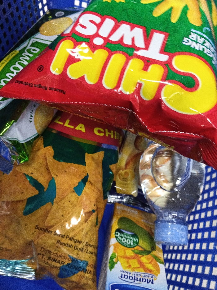 A basket with various snacks and a drink. There is a large bag of "Chiki Twists" visible, along with a bag of "Dilla Chips" which look like tortilla chips. A bottle of water sits alongside a mango juice box labeled "Manfaat Buah dari Alam" with "100% Vitamin C". Some other items are partially visible, including what appears to be a lemon snack. The basket itself has a blue and white checkered pattern.