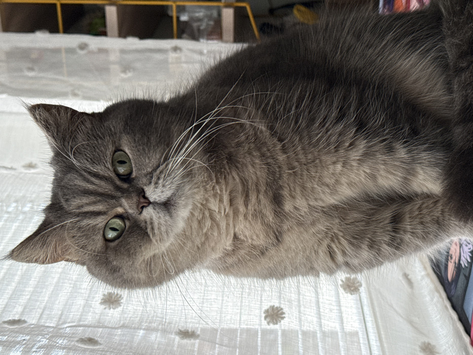 A medium-shot photograph captures a gray domestic cat in an indoor setting in Marchaevo, Bulgaria