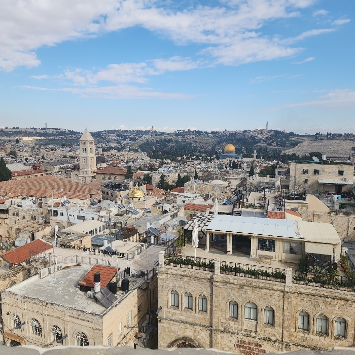An elevated panoramic view captures a dense urban landscape under a partly cloudy blue sky in the Old City of Jerusalem, Israel