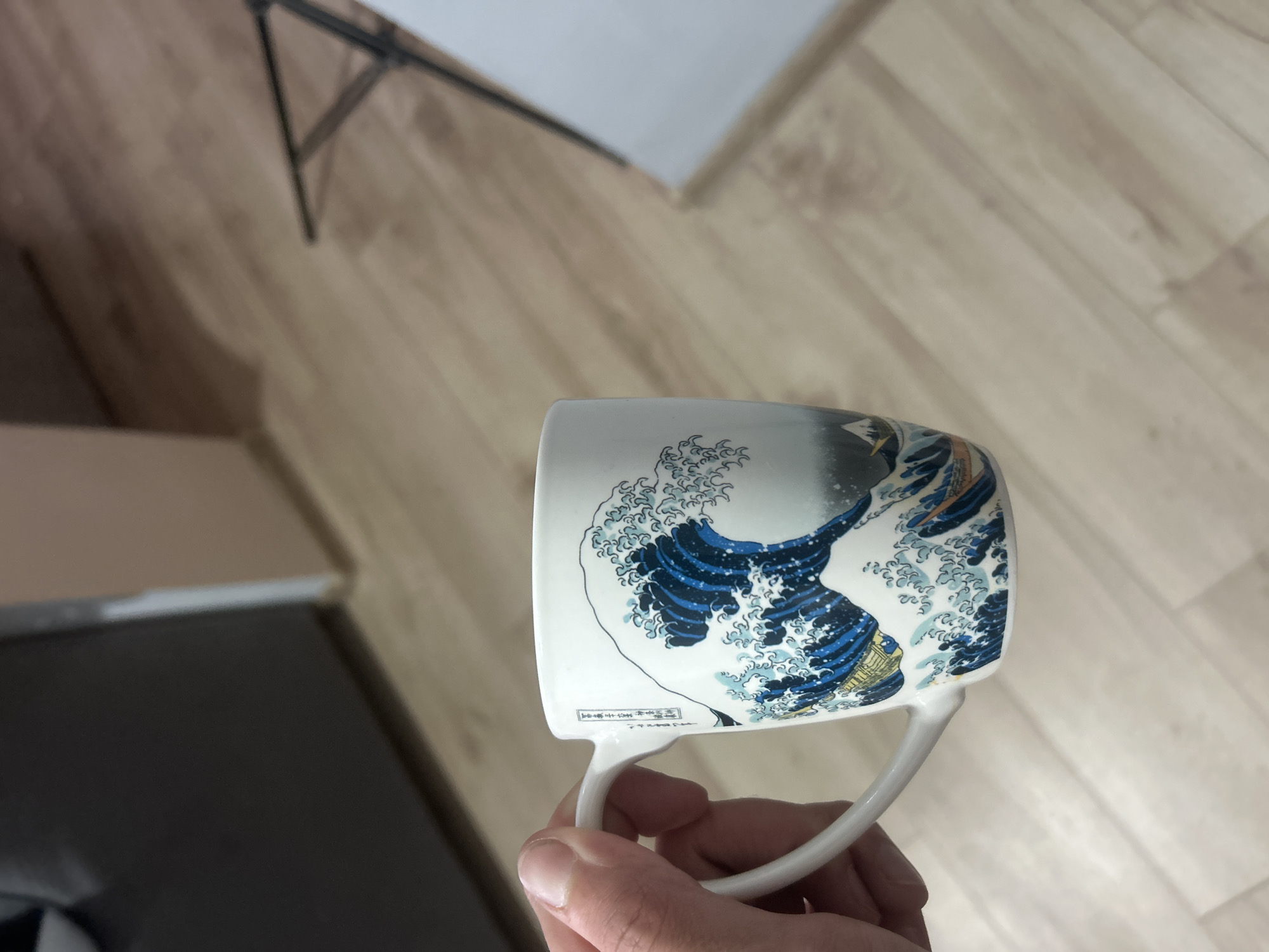 A person is holding a white ceramic mug with a print of the Great Wave off Kanagawa by Hokusai. The background shows a light brown wood-like floor, a partial view of a white lighting rig, and a dark grey object in the lower left. The setting appears to be indoors. The location of the image is not ascertainable from the image and has not been provided.