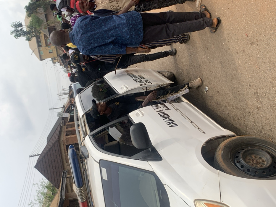 In Otuocha, Anambra State, Nigeria, a white minivan, likely a Toyota Sienna, is stopped on a paved street under an overcast sky