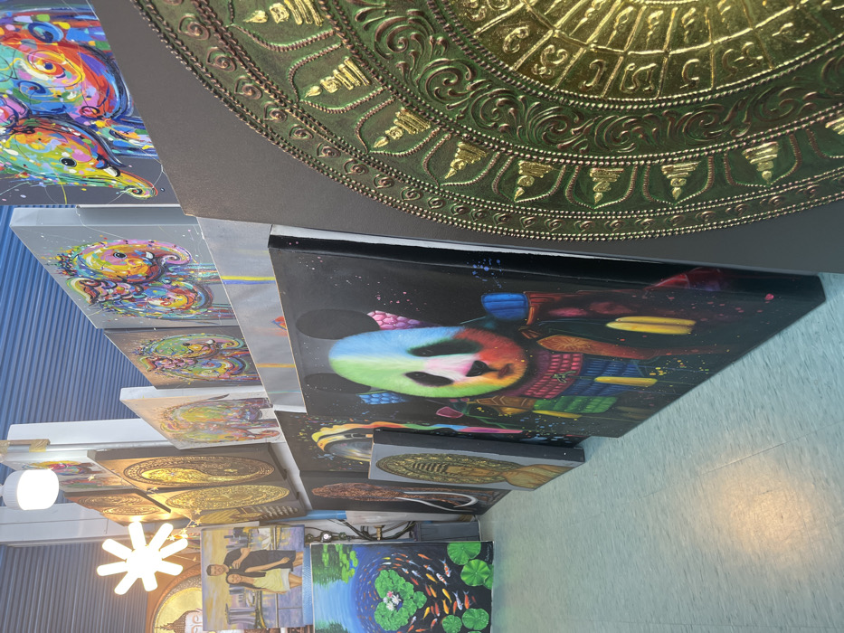 An indoor art display is depicted in a retail setting within บ้านบางรักษ์, Thailand